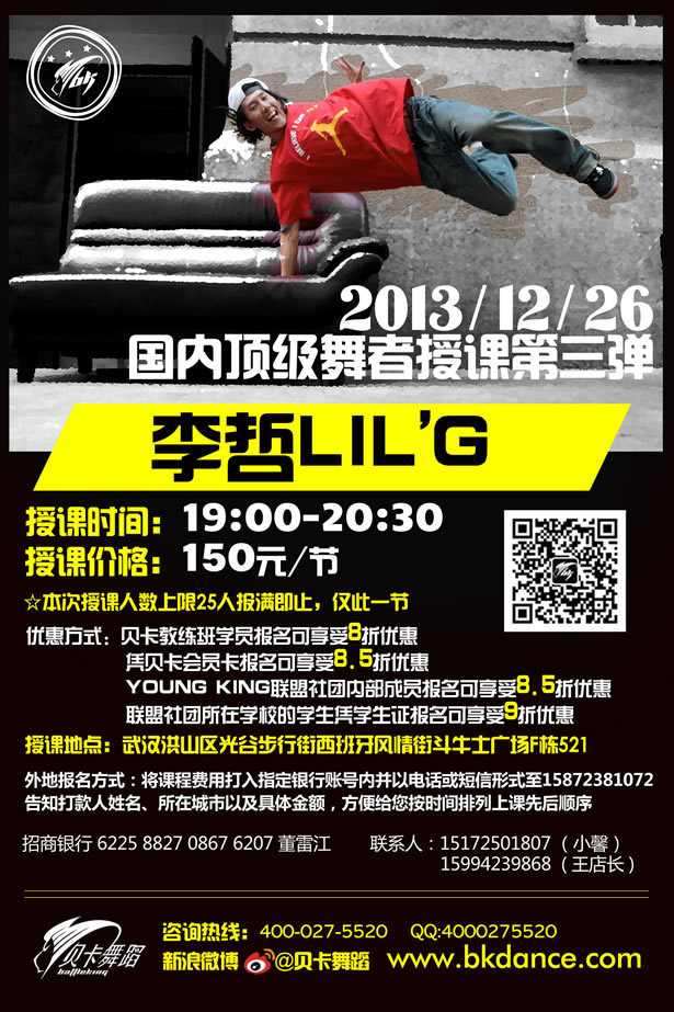 導讀: 國內頂級HIPHOP大師,中國HIPHOP舞蹈領(lǐng)軍人李哲LilG要來(lái)武漢授課了。 2013年12月26日他將會(huì )帶給大家一堂純正的Hiphop課堂體驗。 本次授課150元/節/人,報滿(mǎn)為止,僅此一