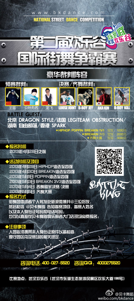導讀: 第二屆武漢歡樂(lè )谷街舞大賽開(kāi)始報名啦!這次比賽貝卡邀請了眾多舞蹈大師擔任裁判,還設置了豐厚的獎金,同時(shí)選手可免費游玩歡樂(lè )谷,更重要的是本次比賽免費,只要轉發(fā)此微博,并@ 三位
