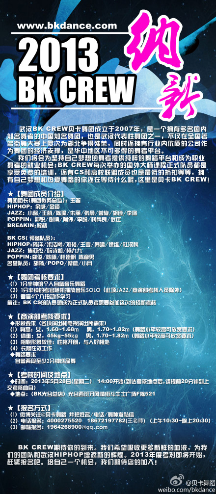 2013貝卡BK CREW上半年招新2013年5月29日開(kāi)始了,當天聚集了武漢80多名高手,經(jīng)過(guò)各項考核,入圍公布:POPPIN' TEAM、JAZZ TEAM、URBANDANCE TEAM、HIPHOP TEAM、BBOY TEAM、商業(yè)部舞蹈演員,歡迎這些新面孔來(lái)到BK的大家庭!在接下來(lái)的時(shí)間里我們將通過(guò)大家的綜合表現定出一線(xiàn)成員、教學(xué)導師、二線(xiàn)\高校精英舞者,這次沒(méi)落選的舞者們下半年招新見(jiàn)咯,大家繼續努力!